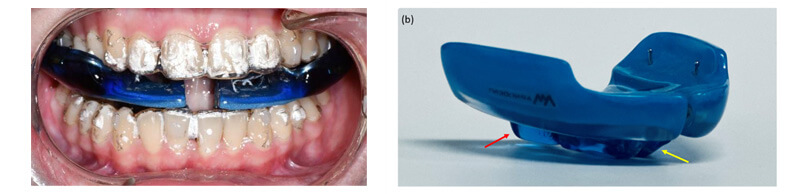 Intraoral photographs showing the patient wearing ApnoTx on the top of the upper and lower Invisalign aligners to manage the temporomandibular joint symptoms and sleep apnea, and prepare the teeth and jaws for expansion