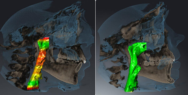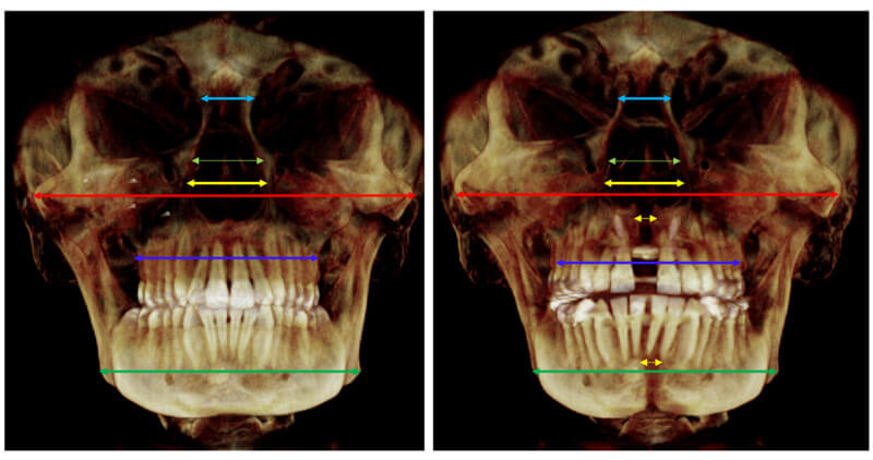 Right, post-expansion and left, post-treatment frontal view, cephalometric, CBCT X-rays. The site of expansion is properly healed, creating an enlarged upper airway to cure sleep apnea.